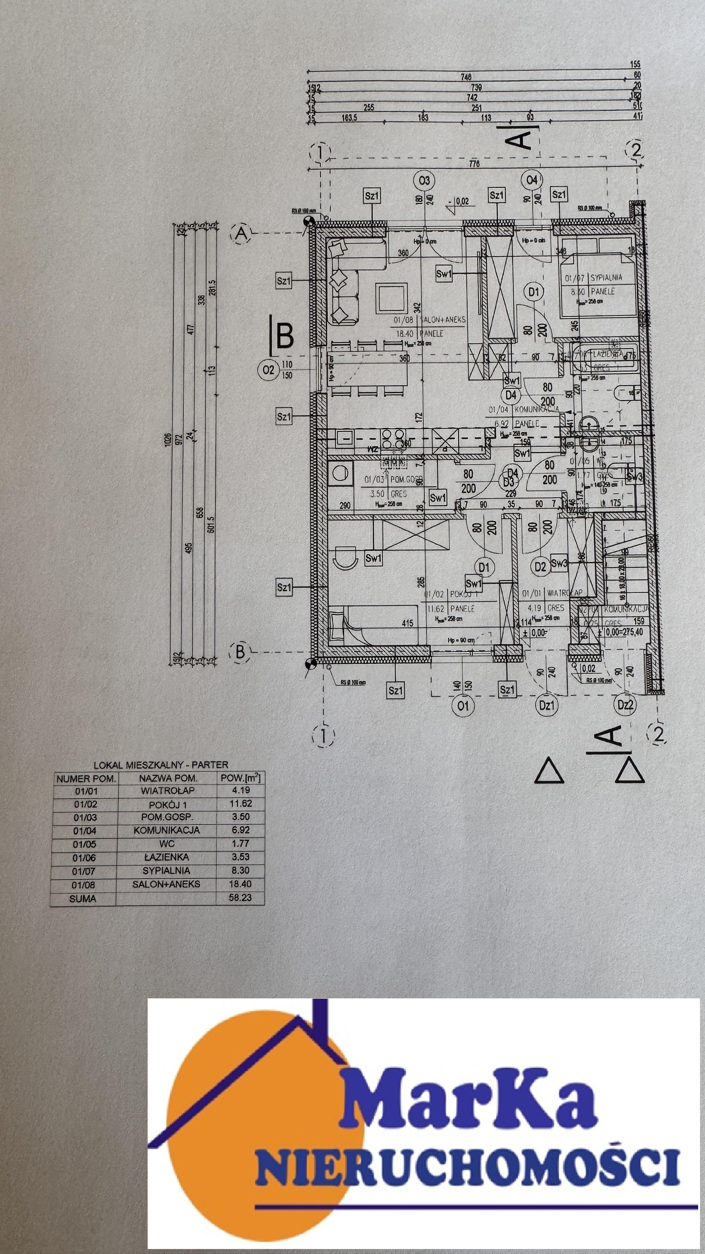 Na sprzedaż 12 nowych mieszkań w stanie deweloperskim o powierzchni parter 58,23m2 i piętro 64m2 zlokalizowanych kameralnych budynkach mieszkalnych jednorodzinnych w zabudowie bliźniaczej o dwóch lokalach mieszkalnych w każdym budynku. Mieszkanie na parterze składa się z sypialni o powierzchni o powierzchni 8,30m2, pokoju o pow. 11,62, salonu z aneksem kuchennym o pow. 18.40m2 z wyjściem na taras, łazienki o pow. 3,53m2 i wc o pow. 1,77m2, wiatrołapu pow. 4,19m2 i pomieszczenia gospodarczego o pow. 3,50m2, komunikacja 6,92. Do mieszkania przynależy ogródek ziemny. Cena 495000zł